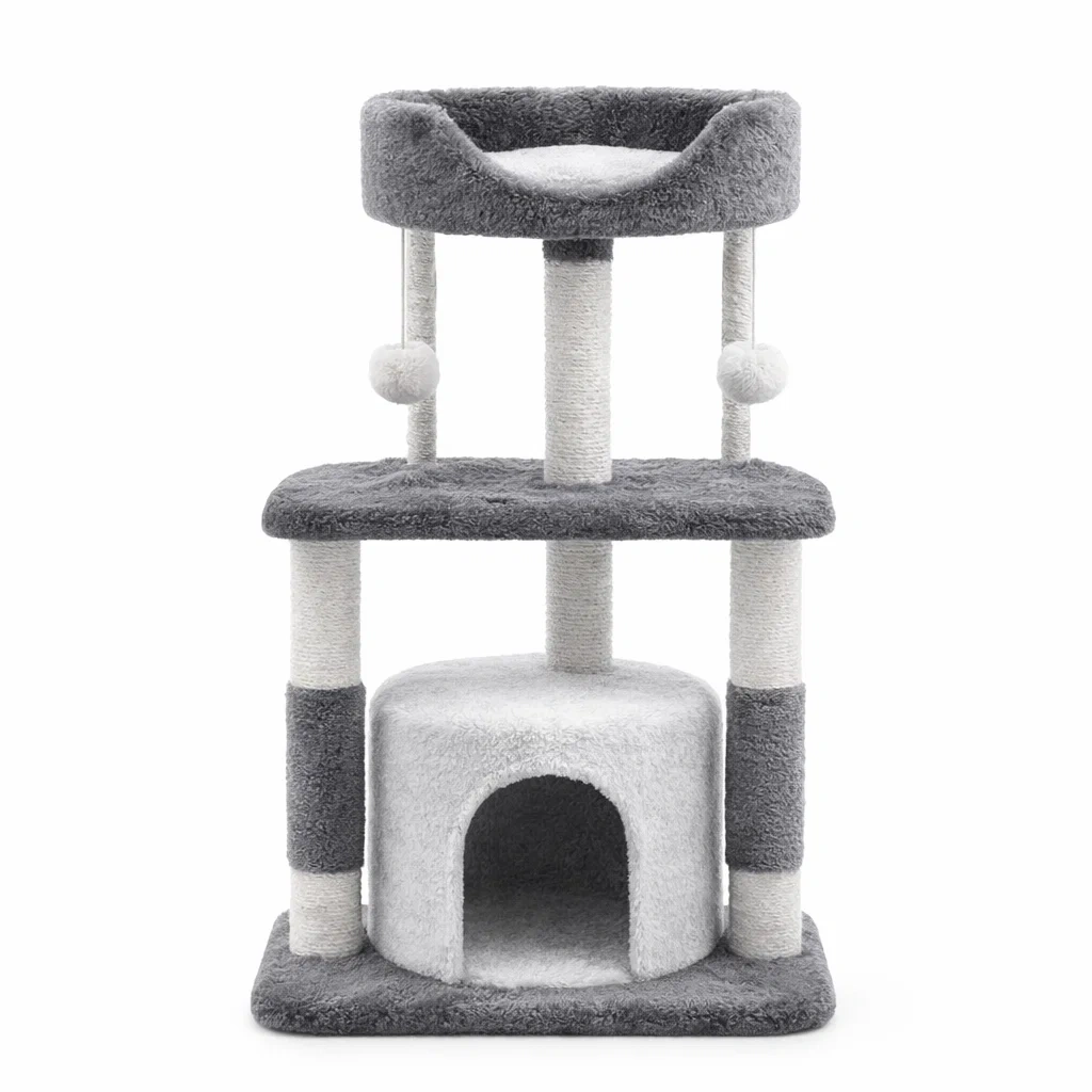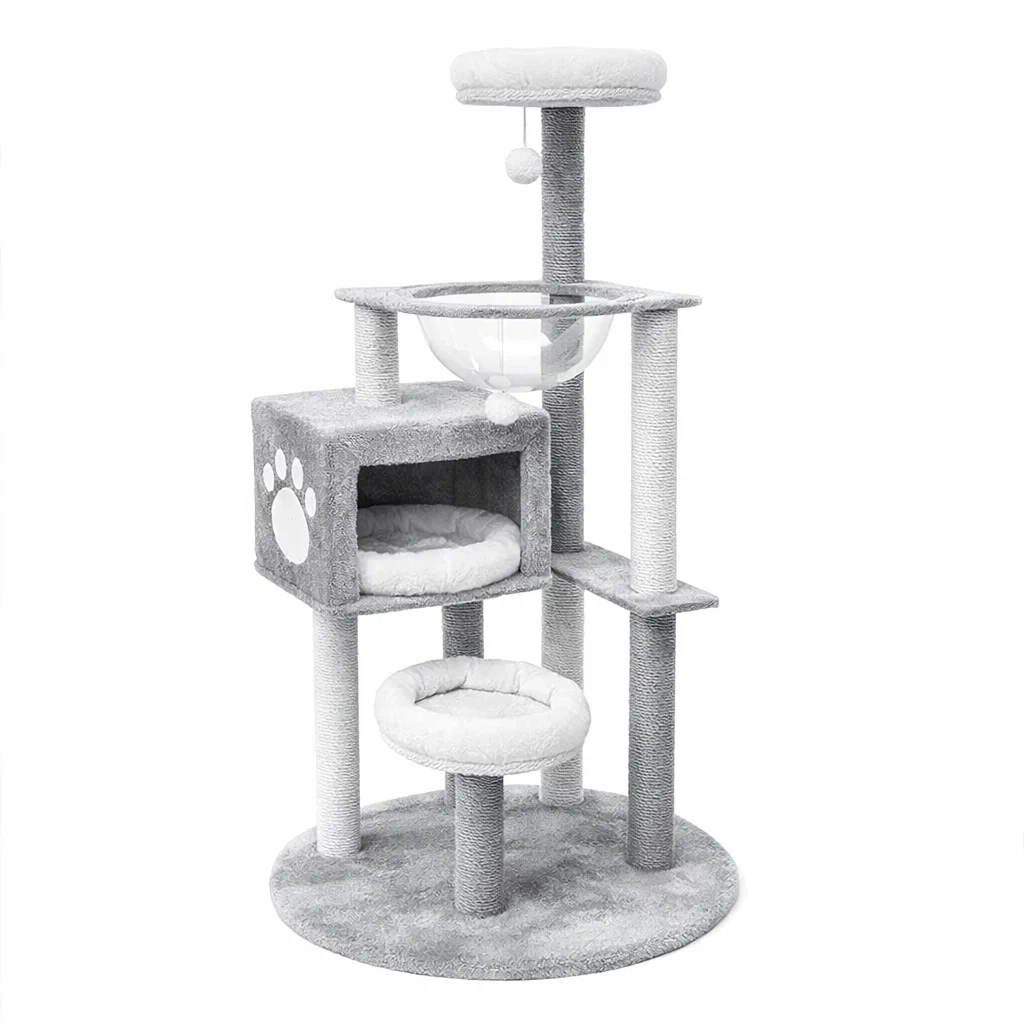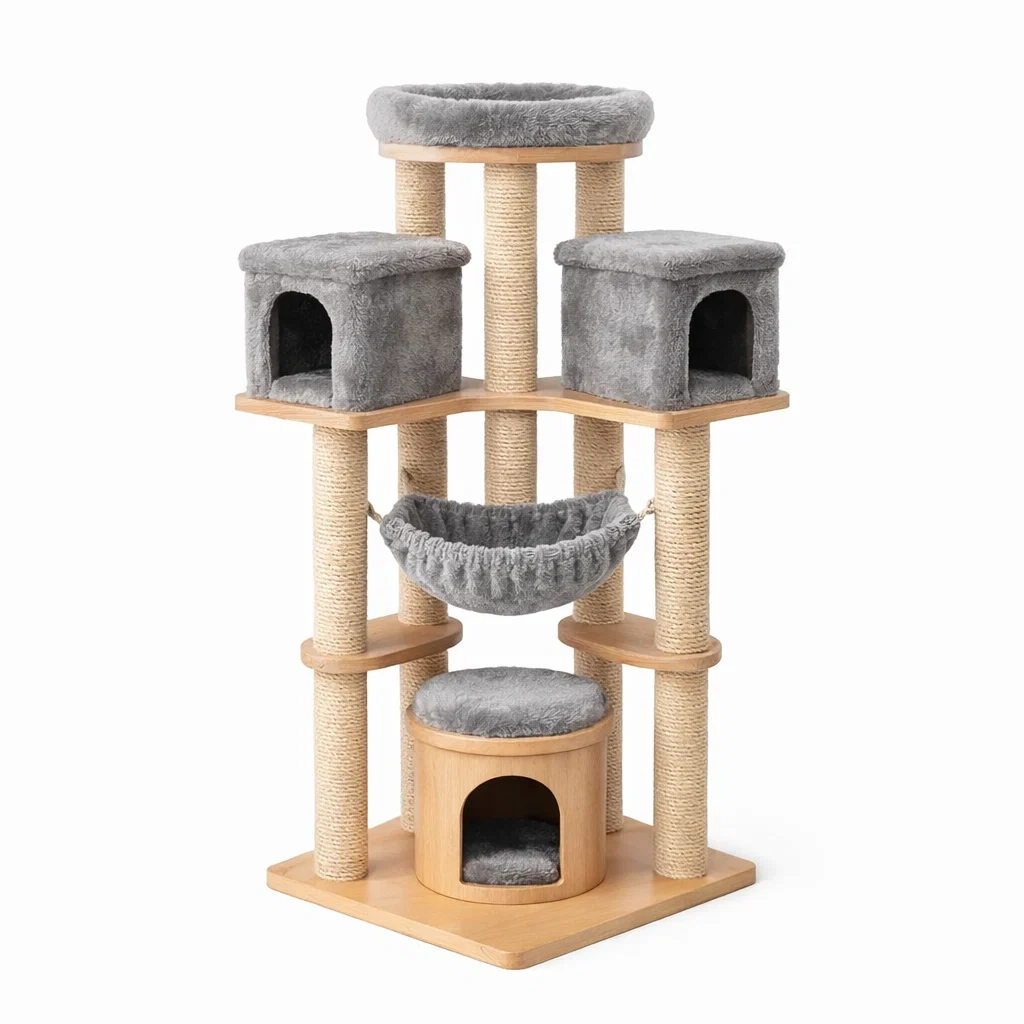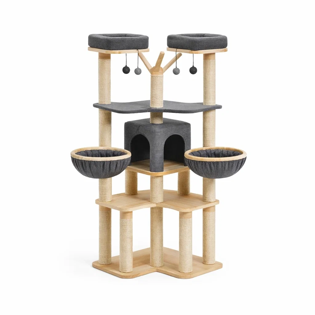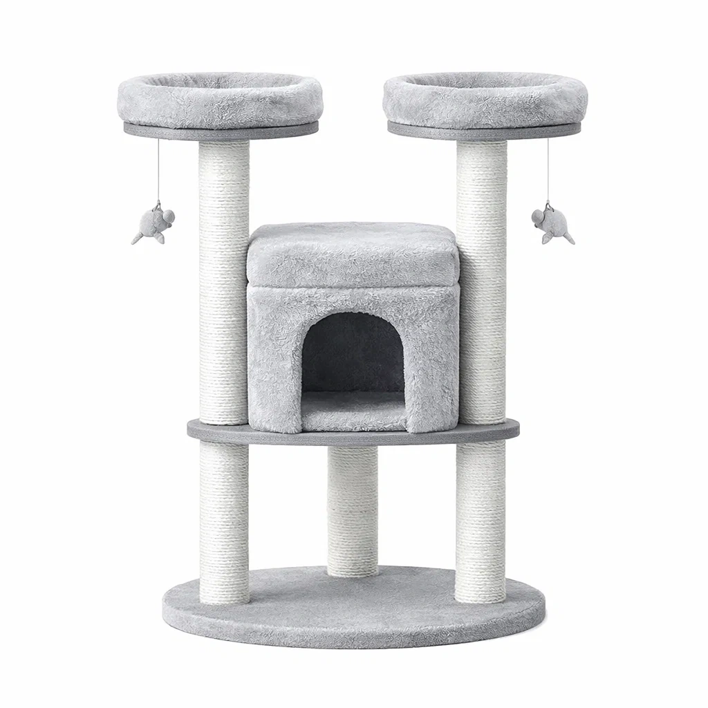 Arbre à chat en bois avec plateformes en peluche grise et poteaux en sisal