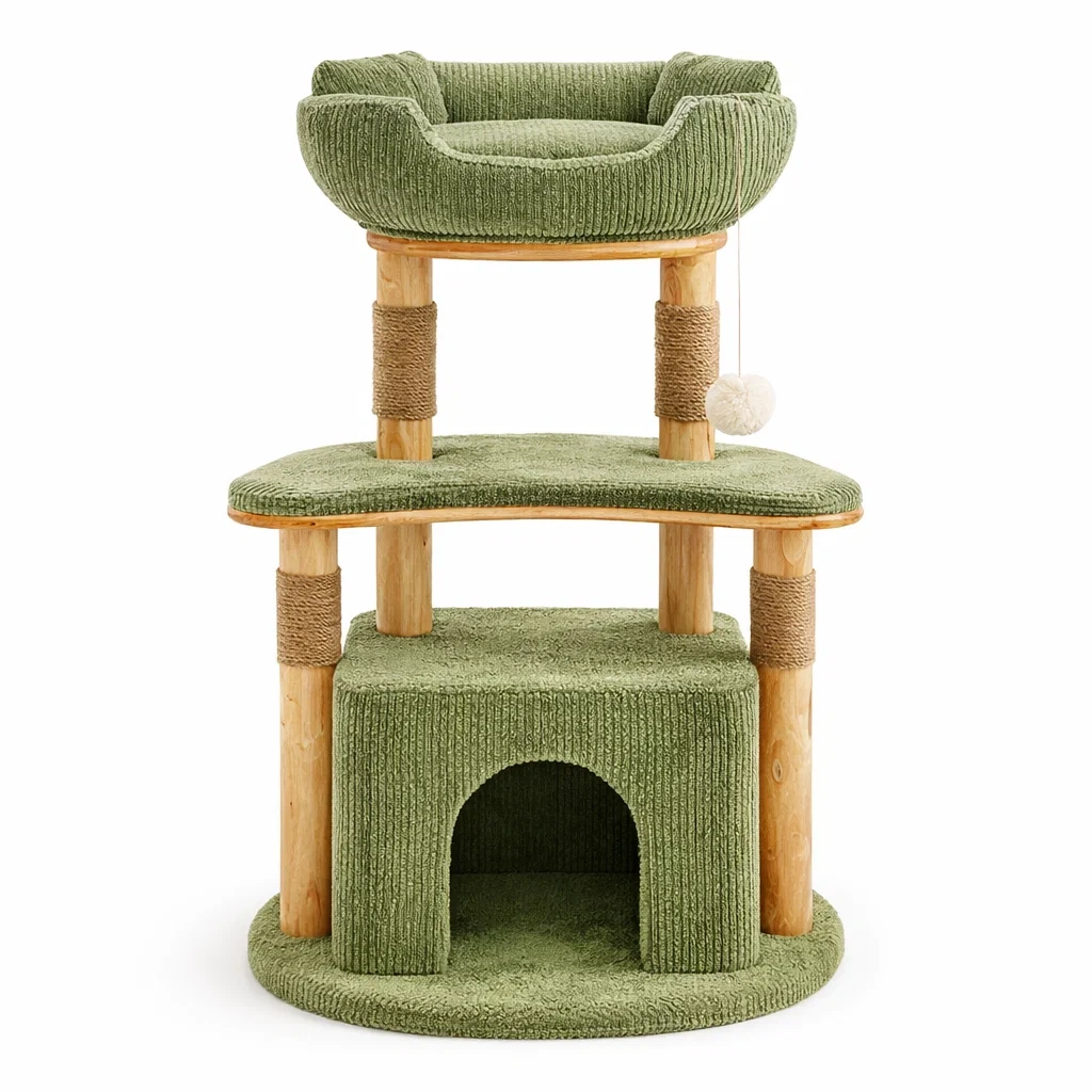 Arbre à chat en bois et sisal avec coussin vert
