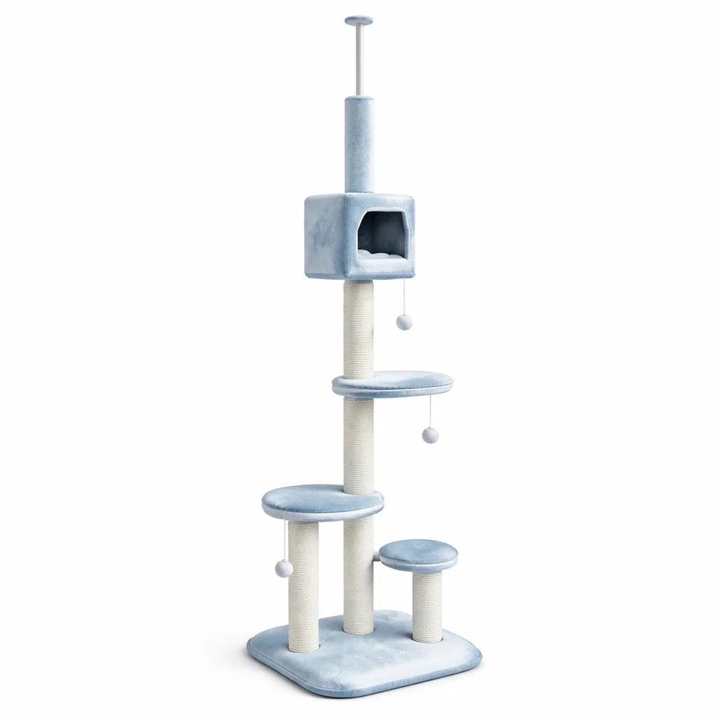 Arbre à chat en sisal et peluche gris bleu rose avec jouet suspendu