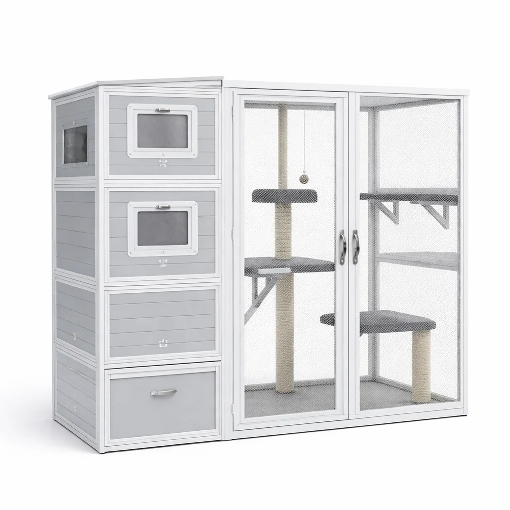 Enclos pour chat en bois gris et blanc avec zones de repos et griffoirs