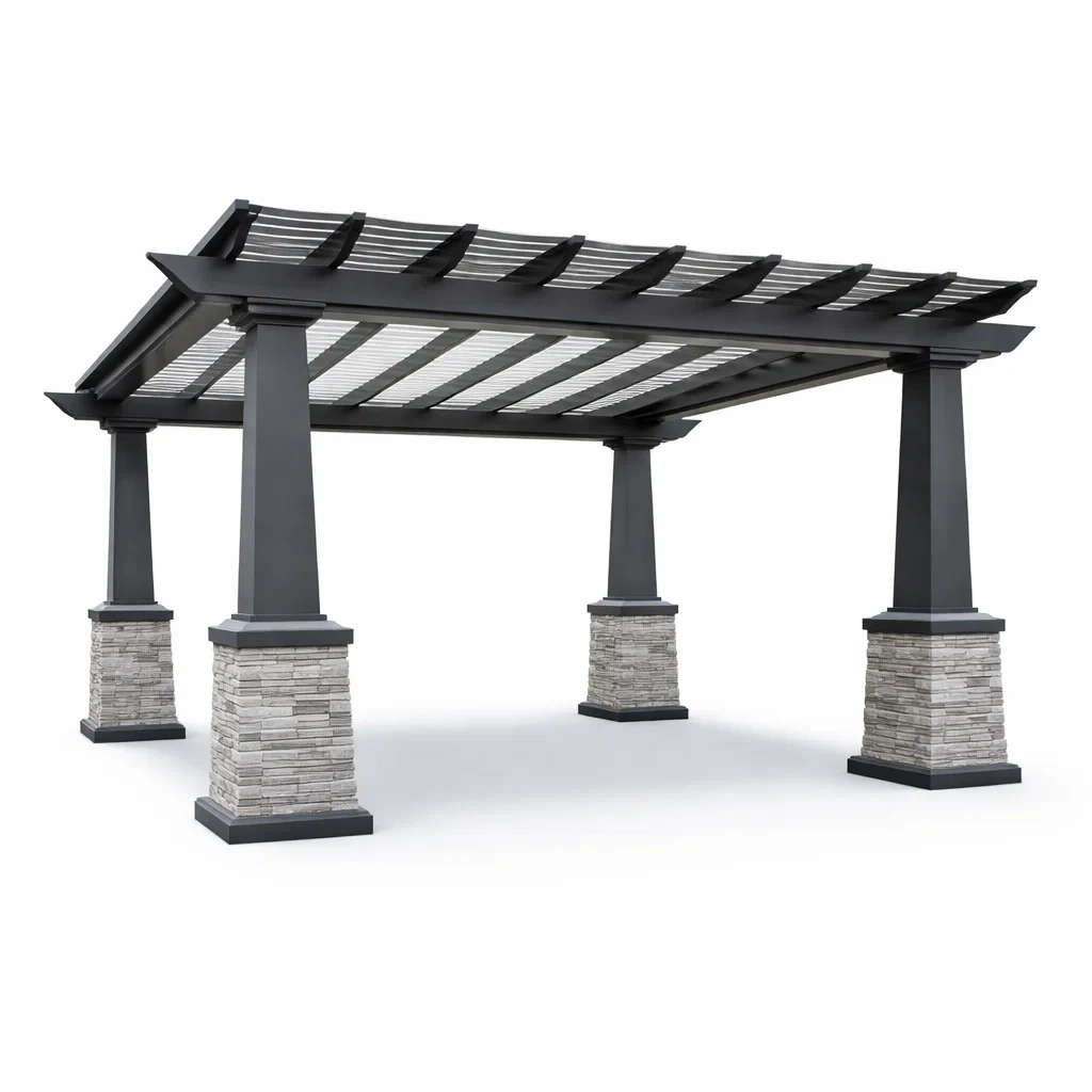 Pergola en aluminium et pierre avec colonnes grises