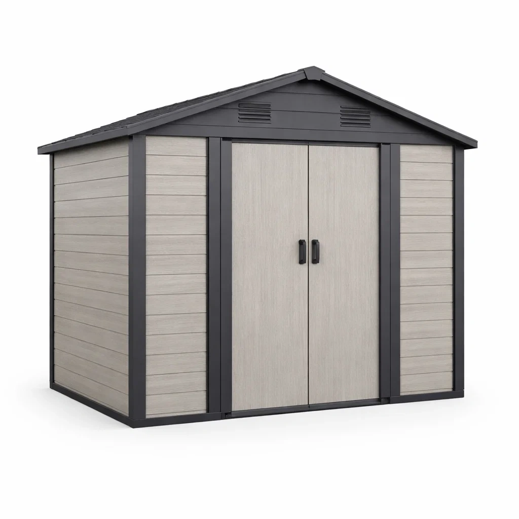 Structure : Cadre en panneaux avec toit double pente et double porte battante. Évents intégrés pour la ventilation.