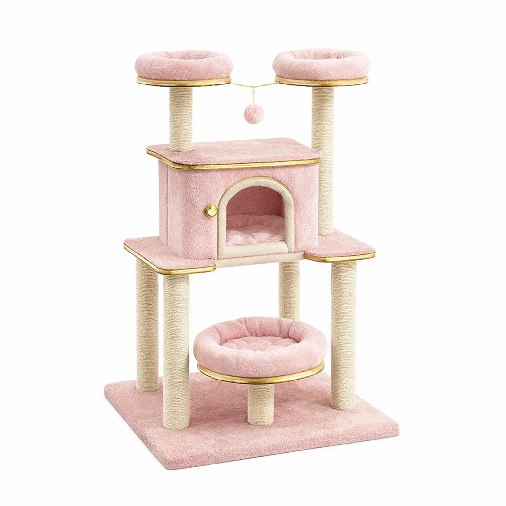 Arbre à chat en bois MDF rose avec plateformes et griffoirs