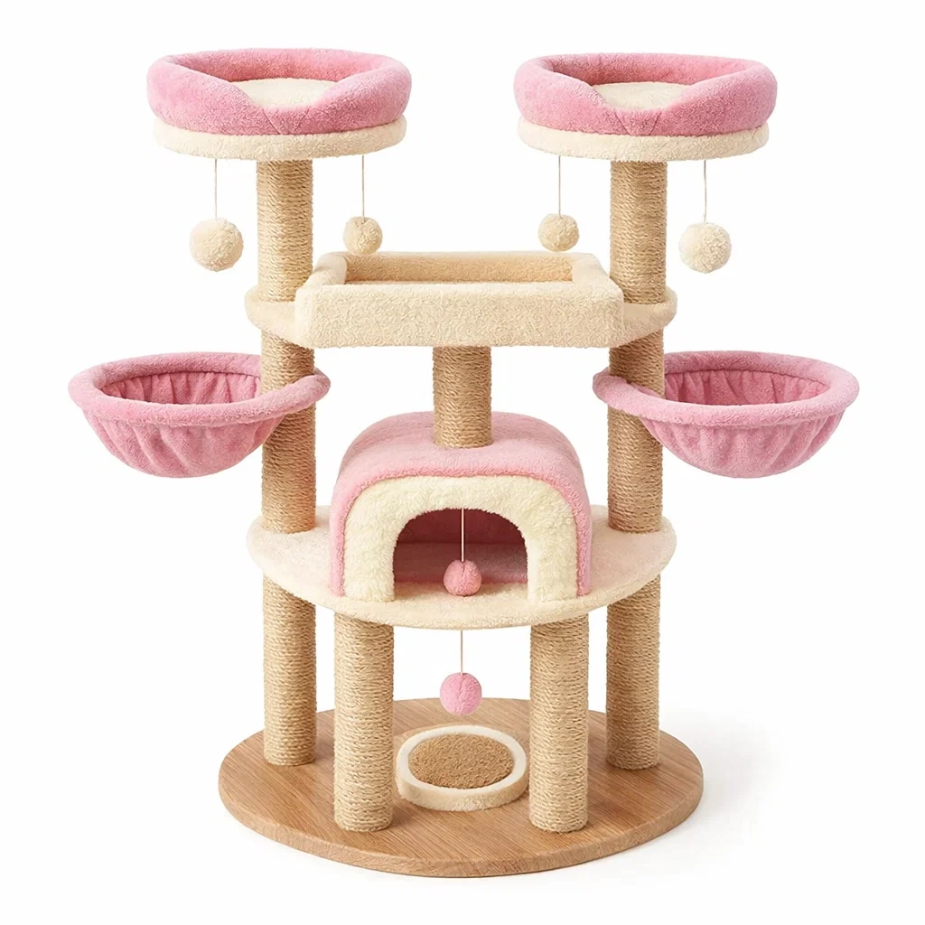 Caractéristiques : Balles suspendues en peluche, multiples plateformes, niches, griffoirs