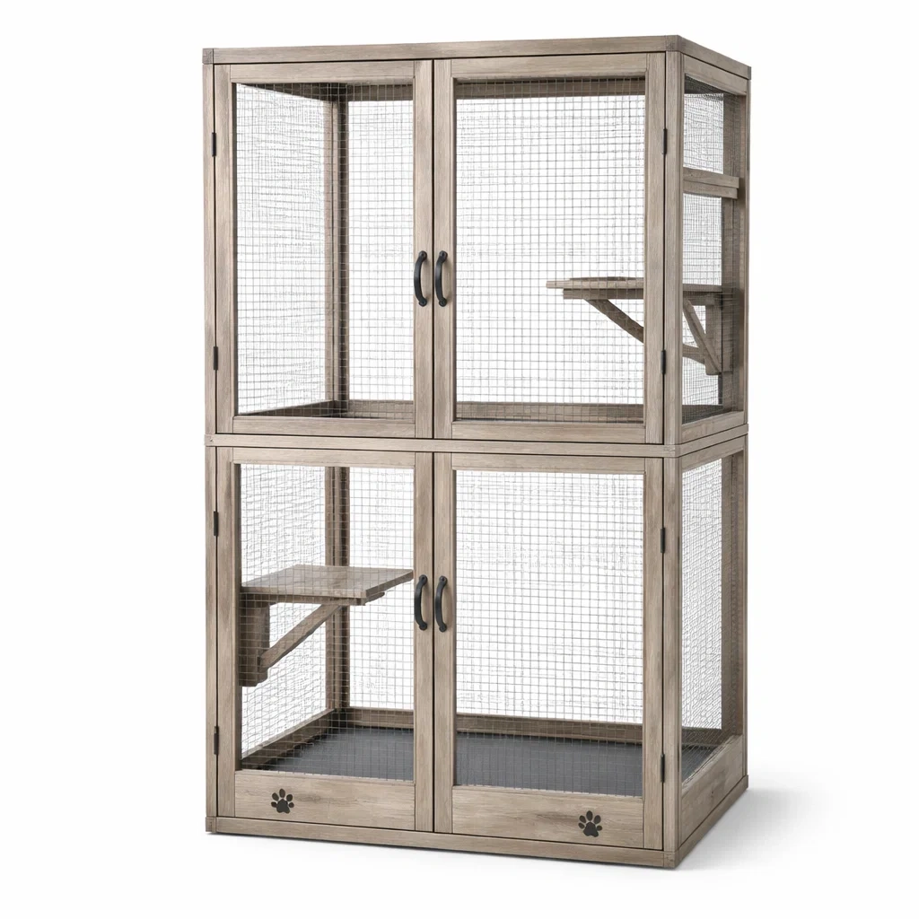 La cage pour chat est construite en bois de sapin avec un grillage métallique en acier galvanisé. Ses dimensions sont de 140 cm de hauteur, 100 cm de largeur et 55 cm de profondeur. Des étagères intégrées offrent un espace supplémentaire pour le jeu et l'exploration. Couleur Marron. Convient pour une utilisation en intérieur ou en extérieur. Charge maximale recommandée: 20 kg.