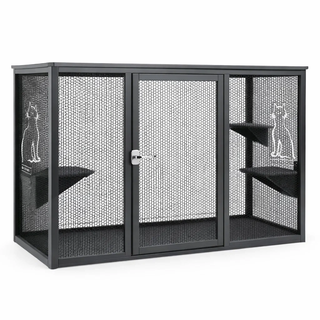 L'enclos pour chats est fabriqué en acier avec des panneaux en grillage métallique assurant ventilation et sécurité. Il inclut des étagères pour le confort des chats, leur permettant de grimper et de se détendre.