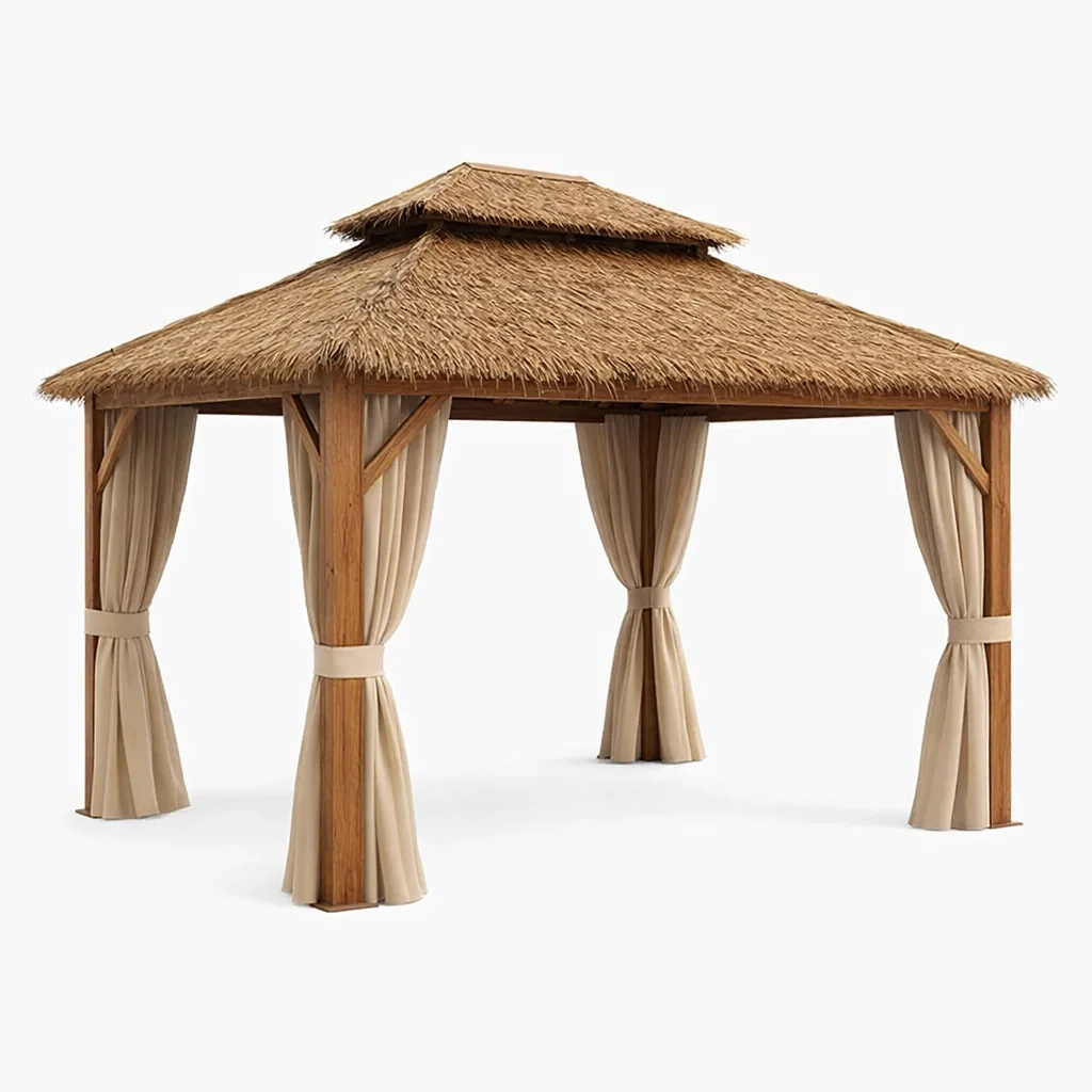Matériaux : Structure en bois, toiture en chaume, rideaux en polyester
