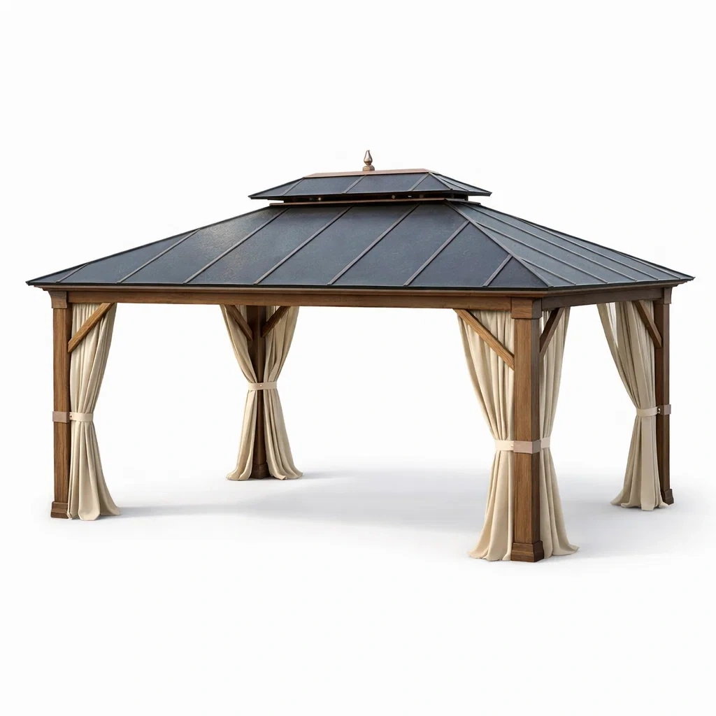 Structure en bois, toit en acier, rideaux en polyester.