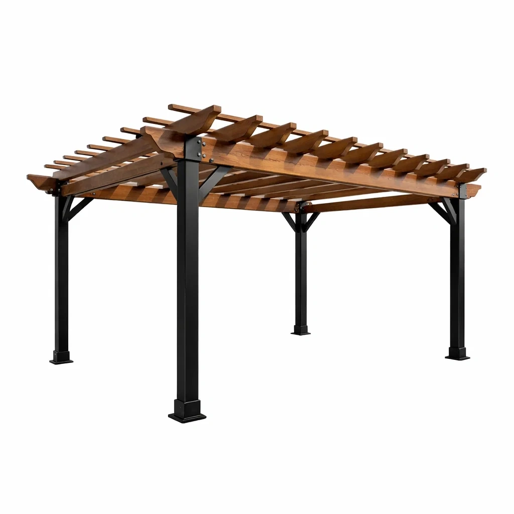 La pergola est fabriquée avec du bois de cèdre massif pour la structure et du métal revêtu pour les supports.