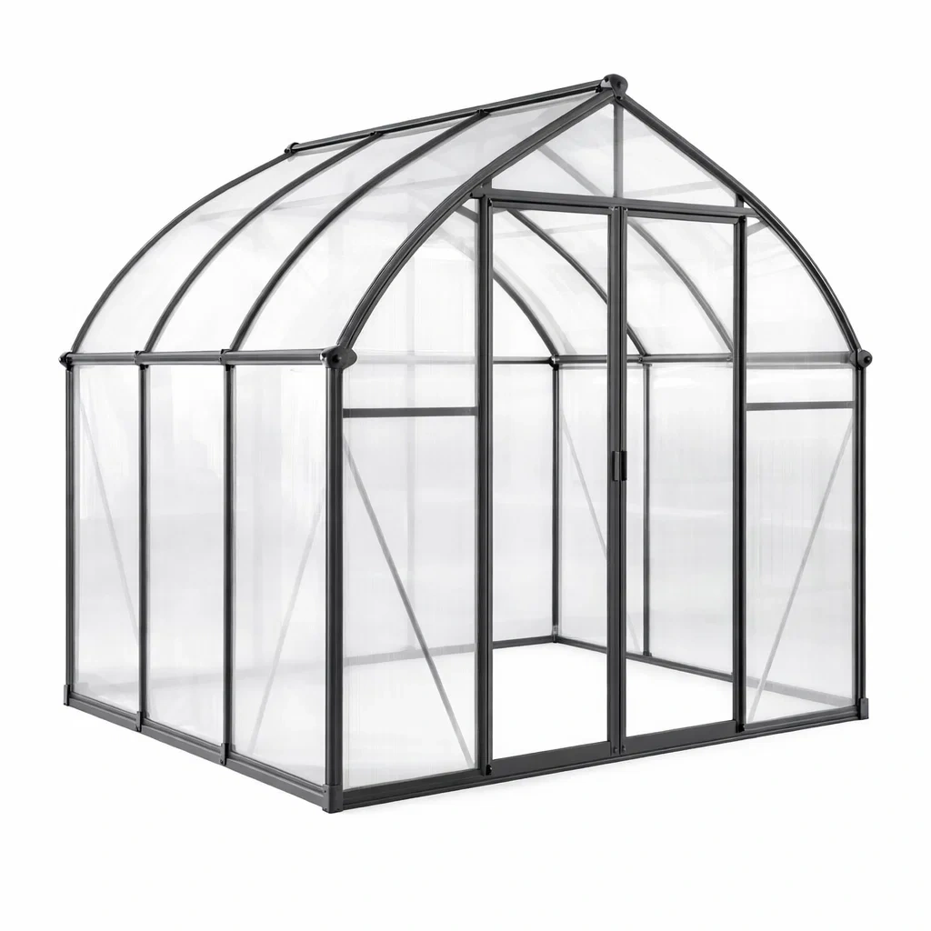 Serre de jardin avec une structure en aluminium et une couverture en panneaux de polycarbonate. Dimensions de 250 cm de longueur, 190 cm de largeur et 190 cm de hauteur. Couleur argentée. Poids total de 60 kg. Équipée d'une porte. Les panneaux offrent une transparence élevée et une bonne résistance aux intempéries. Installation autoportante. Un nettoyage régulier est recommandé pour l'entretien.