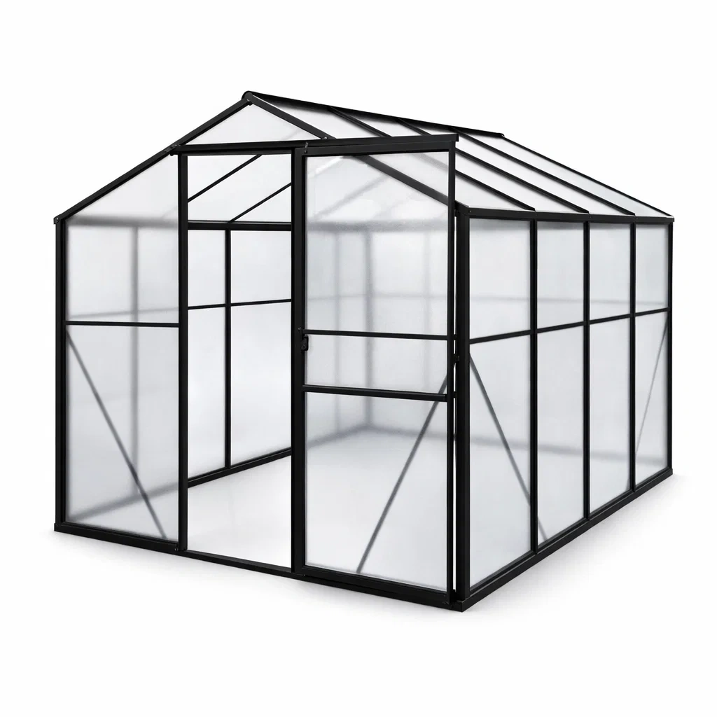 Serre de jardin en panneaux de polycarbonate de 4 mm avec un cadre en aluminium. Dimensions : 3 m x 2 m x 2.1 m. Couleur : Transparent et Noir.
